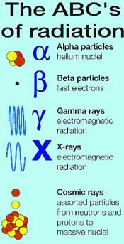 Alpha and beta rays are particles. Gamma rays are electromagnetic radiation, like X-rays but at higher energies. Health physicists worry most about HZE cosmic rays, those with high mass (Z stands for atomic number, which also implies mass) and energy (E). They have two principal sources, the Sun and the galaxy.
