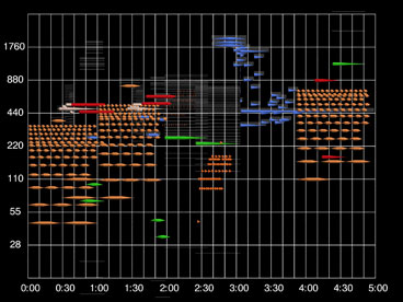 The score of “Stellar Music No. 1.” Time is on the horizontal axis, and frequency (Hz) is on the vertical axis. Each color represents a different stellar instrument. Courtesy of Zoltán Kolláth and Jenő Keuler