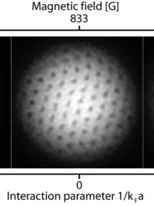The rotating superfluid gas of fermions is pierced with the vortices, which are like mini-tornadoes. Image / Andre Schirotzek, MIT