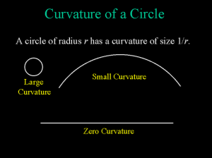 Curvature and Geometry”>A circle of radius r has a curvature of size 1/r. Therefore, small circles have large curvature and large circles have small curvature. The curvature of a line is 0. In general, an object with zero curvature is “flat.”