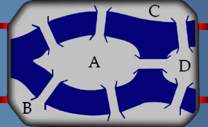 The river Pregel divides the town of Konigsberg into four separate land masses, A, B, C, and D. Seven bridges connect the various parts of town, and some of the town’s curious citizens wondered if it were possible to take a journey across all seven bridges without having to cross any bridge more than once. All who tried ended up in failure, including the Swiss mathematician, Leonhard Euler (1707-1783)(pronounced “oiler”), a notable genius of the eighteenth-century.