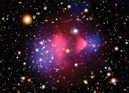 CRASH COURSE. This composite image from several observatories and telescopes shows where two clusters of galaxies collided 100 million years ago. The ordinary matter, shown in pink, from the two galaxies collided, whereas the dark matter from each galaxy, shown in purple, passed straight through.