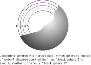Figure 8 [replaced by our Figure 2] is to be conceived three-dimensionally, the circles being cross-sections of spherical shells in the plane of the drawing. A man is climbing about on the huge spherical surface 1; by measurements with rigid rods he recognizes it as a spherical shell, i.e. he finds the geometry of the surface of a sphere. Since the third dimension is at his disposal, he goes to spherical shell 2. Does the second shell lie inside the first one, or does it enclose the first shell? He can answer this question by measuring 2. Assume that he finds 2 to be the smaller surface; he will say that 2 is situated inside of 1. He goes now to 3 and finds that 3 is as large as 1.