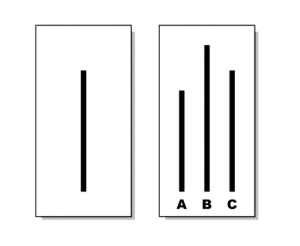 One of the pairs of cards used in the experiment. The card on the left has the reference line and the one on the right shows the three comparison lines.Experiments led by Solomon Asch asked groups of students to participate in a “vision test.” In reality, all but one of the participants were confederates of the experimenter, and the study was really about how the remaining student would react to the confederates’ behavior.