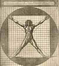 The navel is naturally placed in the centre of the human body, and, if in a man lying with his face upward, and his hands and feet extended, from his navel as the centre, a circle be described, it will touch his fingers and toes. It is not alone by a circle, that the human body is thus circumscribed, as may be seen by placing it within a square. For measuring from the feet to the crown of the head, and then across the arms fully extended, we find the latter measure equal to the former; so that lines at right angles to each other, enclosing the figure, will form a square.
