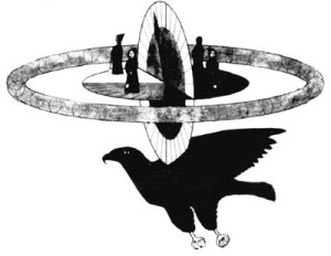 There is a vertical and a horizontal circle, having a common centre. This is the world clock. It is supported by the black bird.