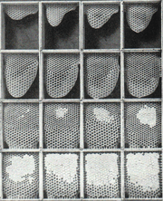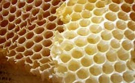 “There are two possible explanations for the reason that honeycomb is composed of hexagons, rather than any other shape. One, given by Jan Brożek, is that the hexagon tiles the plane with minimal surface area. Thus a hexagonal structure uses the least material to create a lattice of cells within a given volume. Another, given by D’Arcy Wentworth Thompson, is that the shape simply results from the process of individual bees putting cells together: somewhat analogous to the boundary shapes created in a field of soap bubbles. In support of this he notes that queen cells, which are constructed singly, are irregular and lumpy with no apparent attempt at efficiency“.