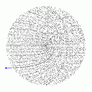 It looks as though primes tend to concentrate in certain curves that swoop away to the northwest and southwest, like the curve marked by the blue arrow. (The numbers on that curve are of the form x(x+1) + 41, the famous prime-generating formula discovered by Euler in 1774.). See more info on Mersenne Prime.