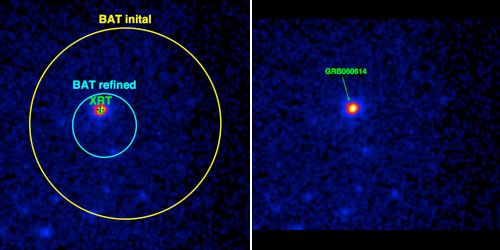 Hybrids in the Universe?-12.20.06X-ray image of the gamma-ray burst GRB 060614 taken by the XRT instrument on Swift. The burst glowed in X-ray light for more than a week following the gamma-ray burst. This so-called “afterglow” gave an accurate position of the burst on the sky and enabled the deep optical observations made by ground-based observatories and the Hubble Space Telescope. Credit: NASA/Swift Team