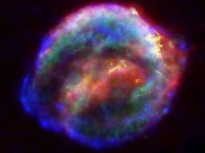 Four hundred years ago, sky watchers, including the famous astronomer Johannes Kepler, were startled by the sudden appearance of a “new star” in the western sky, rivaling the brilliance of the nearby planets. Now, astronomers using NASA’s three Great Observatories are unraveling the mysteries of the expanding remains of Kepler’s supernova, the last such object seen to explode in our Milky Way galaxy.This combined image — from NASA’s Spitzer Space Telescope, Hubble Space Telescope, and e Chandra X-ray Observatory — unveils a bubble-shaped shroud of gas and dust that is 14 light-years wide and is expanding at 4 million miles per hour (2,000 kilometers per second). Observations from each telescope highlight distinct features of the supernova remnant, a fast-moving shell of iron-rich material from the exploded star, surrounded by an expanding shock wave that is sweeping up interstellar gas and dust.
