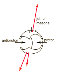 Deep inelastic scattering experiments provided the evidence that the proton and neutron are made up of three more fundamental particles called quarks . One type of experiment in the proton-antiproton colliders produces jets of mesons which correlate with the models of quark confinement. As visualized in the bag model for quark confinement, an individual quark cannot be pulled free because the energy required to do it is much greater than the pair production energy of a quark-antiquark pair. If in a high energy collision, something scatters directly off one of the constituent quarks, it will give it a high energy. With an energy many times the pair production energy, it will create a jet of quark-antiquark pairs (mesons).