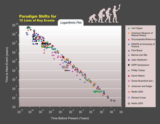 According to Ray Kurzweil, his logarithmic graph of 15 lists of paradigm shifts for key historicexponential trend.[clarification needed] The lists’ compilers include Carl Sagan, Paul D. Boyer, Encyclopædia Britannica, American Museum of Natural History, and University of Arizona.