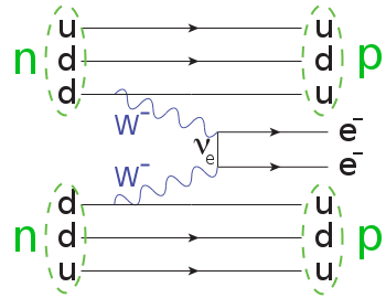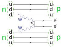 Feynman diagram of neutrinoless double-beta decay, with two neutrons decaying to two protons. The only emitted products in this process are two electrons, which can only occur if the neutrino and antineutrino are the same particle (i.e. Majorana neutrinos) so the same neutrino can be emitted and absorbed within the nucleus. In conventional double-beta decay, two antineutrinos – one arising from each W vertex – are emitted from the nucleus, in addition to the two electrons. The detection of neutrinoless double-beta decay is thus a sensitive test of whether neutrinos are Majorana particles.