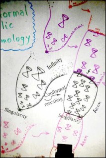 | Penrose’s Conformal Cyclic Cosmology, from one of his Pittsburgh lecture slides in June, 2009. Photo by Bryan W. Roberts