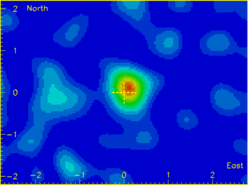 The Moon‘s cosmic ray shadow, as seen in secondary muons generated by cosmic rays in the atmosphere, and detected 700 meters below ground, at the Soudan II detector. |