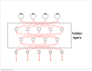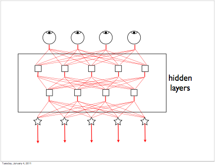 In this picture, the flow of information runs from top to bottom. Sensory neurons — the eyeballs at the top — take input from the external world and encode it into a convenient form (which is typically electrical pulse trains for biological neurons, and numerical data for the computer “neurons” of artificial neural networks). They distribute this encoded information to other neurons, in the next layer below. Effector neurons — the stars at the bottom — send their signals to output devices (which are typically muscles for biological neurons, and computer terminals for artificial neurons). In between are neurons that neither see nor act upon the outside world directly. These inter-neurons communicate only with other neurons. They are the hidden layers.WHAT SCIENTIFIC CONCEPT WOULD IMPROVE EVERYBODY’S COGNITIVE TOOLKIT?