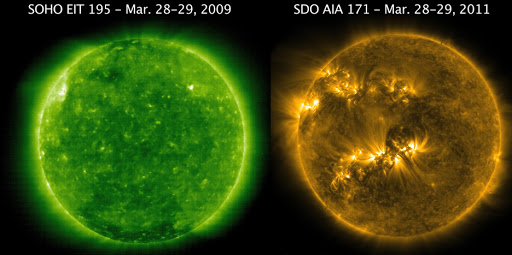 A side-by-side comparison of the Sun from precisely two years ago (left, from SOHO) to the present (right, from Solar Dynamics Observatory) dramatically illustrates just how active the Sun has become (Mar. 27-28, 2011). Viewed in two similar wavelengths of extreme ultraviolet light, the Sun now sports numerous active regions that appear as lighter areas that are capable of producing solar storms. Two years ago the Sun was in a very quiet period (solar minimum). The Sun’s maximum period of activity is predicted to be around 2013, so we still have quite a ways to go.See: Solar Dynamics Observatory