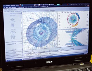 | A computer screen in the ALICE control room shows an event display on the night of the first heavy-ion collisions in the LHC in November 2010. |