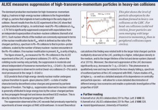 Jet quenching was first observed at RHIC by measuring the yields of hadrons with high transverse momentum (pT). These particles are produced via fragmentation of energetic partons. The yields of these high-pT particles in central nucleus–nucleus collisions were found to be a factor of five lower than expected from the measurements in proton–proton reactions. ALICE has recently published the measurement of charged particles in central heavy-ion collisions at the LHC. As at RHIC, the production of high-pT hadrons at the LHC is strongly suppressed. However, the observations at the LHC show qualitatively new features (see box). The observation from ALICE is consistent with reports from the ATLAS and CMS collaborations on direct evidence for parton energy loss within heavy-ion collisions using fully reconstructed back-to-back jets of particles associated with hard parton scatterings (CERN Courier January/February 2011 p6 and March 2011 p6). The latter two experiments have shown a strong energy imbalance between the jet and its recoiling partner (G Aad et al. 2010 and CMS collaboration 2011). This imbalance is thought to arise because one of the jets traversed the hot and dense matter, transferring a substantial fraction of its energy to the medium in a way that is not recovered by the reconstruction of the jets.See: ALICE enters new territory in heavy-ion collisions