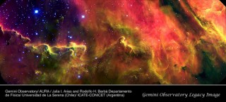 The Lagoon Nebula (catalogued as Messier 8 or M8, and as NGC 6523) is a giant interstellar cloud in the constellation Sagittarius. It is classified as an emission nebula and as an H II region.