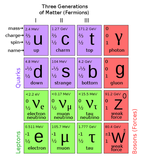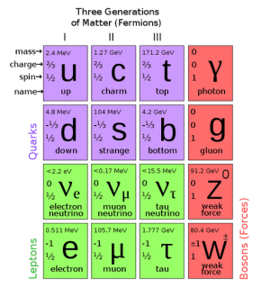 | Six of the particles in the Standard Model are quarks (shown in purple). Each of the first three columns forms a generation of matter.
