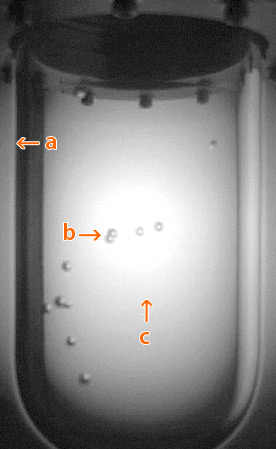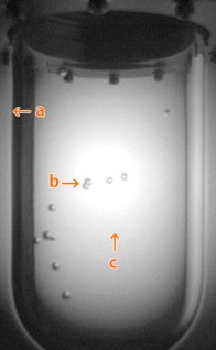 The Chicagoland Observatory for Underground Particle Physics (COUPP) collaboration looks for bubbles in chambers filled with a compound containing carbon, fluorine and iodine. The fluid is superheated beyond the boiling point but has no rough surface to form bubbles. When a specific type of particle interacts in the chamber, it can deposit enough energy to boil the fluid and make a bubble. Electrons do not produce bubbles, while a dark matter particle interacting with a nucleus can – making this the key for dark matter detection. See:Bubble chamber gets more precise in dark matter search