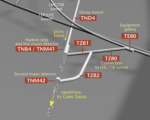 A 400 GeV/c proton beam is extracted from the SPS in 10.5 microsecond short pulses of 2.4×1013 protons per pulse. The proton beam is transported through the transfer line TT41 to the CNGS target T40. The target consists of a series of graphite rods, which are cooled by a recirculated helium flow. Secondary pions and kaons of positive charge produced in the target are focused into a parallel beam by a system of two pulsed magnetic lenses, called horn and reflector. A 1 km long evacuated decay pipe allows the pions and kaons to decay into their daughter particles – of interest here is mainly the decay into muon-neutrinos and muons. The remaining hadrons (protons, pions, kaons) are absorbed in an iron beam dump with a graphite core. The muons are monitored in two sets of detectors downstream of the dump. Further downstream, the muons are absorbed in the rock while the neutrinos continue their travel towards Gran Sasso.microsecond short pulses of 2.4×1013 protons per