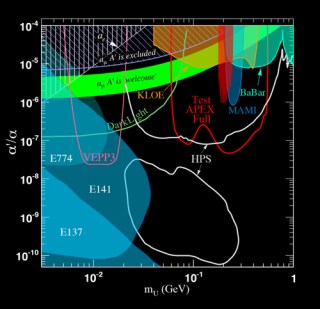 | APEX is one of several experiments hunting for the carrier of a new force, a hypothetical boson dubbed A’. This graph shows the range of the parameter space covered by these proposed experiments. The solid red is the slice of parameter space covered by APEX’s test run. The full APEX experiment will search the entire area above the red curve. See: PI Science: Hunting for New Forces |