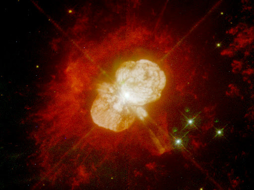 Although 19th century astronomers did not have telescopes powerful enough to see the 1843 outburst in detail, its effects can be studied today. The huge clouds of matter thrown out a century and a half ago, known as the Homunculus Nebula, have been a regular target for Hubble since its launch in 1990. This image, taken with the Advanced Camera for Surveys High Resolution Channel is the most detailed yet, and shows how the material from the star was not thrown out in a uniform manner, but forms a huge dumbbell shape.Eta Carinae is not only interesting because of its past, but also because of its future. It is one of the closest stars to Earth that is likely to explode in a supernova in the relatively near future (though in astronomical timescales the “near future” could still be a million years away). When it does, expect an impressive view from Earth, far brighter still than its last outburst: SN 2006gy, the brightest supernova ever observed, came from a star of the same type.