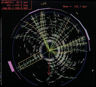 Top quark and anti top quark pair decaying into jets, visible as collimated collections of particle tracks, and other fermions in the CDF detector at Tevatron. HiggsJetEnergyProfileCrotale and HiggsJetEnergyProfilePiano use only the energy of the cells in the jet to modulate the pitch, volume, duration and spatial position of each note. The sounds being modulated in these examples are crotales (baby cymbals) and a piano string struck with a soft beater, then shifted up in pitch by 1000 Hz and `dovetailed’.