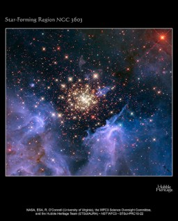 Most of the stars in the cluster were born around the same time but differ in size, mass, temperature, and color. The course of a star’s life is determined by its mass, so a cluster of a given age will contain stars in various stages of their lives, giving an opportunity for detailed analyses of stellar life cycles. NGC 3603 also contains some of the most massive stars known. These huge stars live fast and die young, burning through their hydrogen fuel quickly and ultimately ending their lives in supernova explosions.</br>