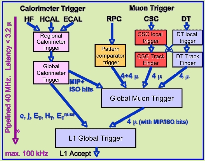 To accomplish this, a series of “trigger” stages are employed. All the data from each crossing is held in buffers within the detector while a small amount of key information is used to perform a fast, approximate calculation to identify features of interest such as high energy jets, muons or missing energy. This “Level 1” calculation is completed in around 1 µs, and event rate is reduced by a factor of about thousand down to 50 kHz. All these calculations are done on fast, custom hardware using reprogrammable FPGAs.If an event is passed by the Level 1 trigger all the data still buffered in the detector is sent over fibre-optic links to the “High Level” trigger, which is software (mainly written in C++) running on ordinary computer servers. The lower event rate in the High Level trigger allows time for much more detailed analysis of the event to be done than in the Level 1 trigger. The High Level trigger reduces the event rate by a further factor of about a thousand down to around 100 events per second. These are then stored on tape for future analysis.