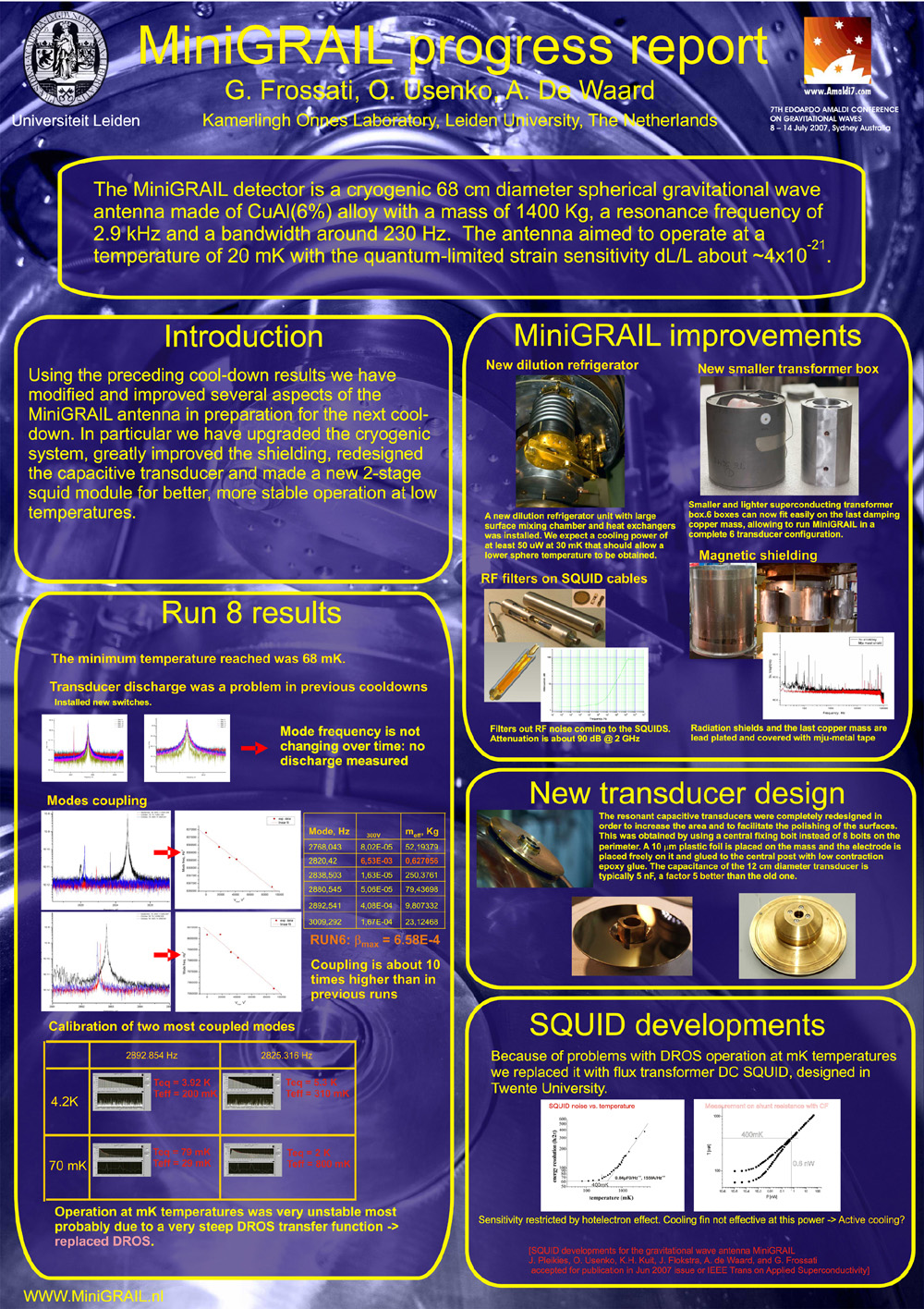 MiniGRAIL is a spherical gravitational-wave antenna using this principle. It is based at Leiden University, consisting of an exactingly machined 1150 kg sphere cryogenically cooled to 20 mK.[2] The spherical configuration allows for equal sensitivity in all directions, and is somewhat experimentally simpler than larger linear devices requiring high vacuum. Events are detected by measuring deformation of the detector sphere. MiniGRAIL is highly sensitive in the 2–4 kHz range, suitable for detecting gravitational waves from rotating neutron star instabilities or small black hole mergers.[3]