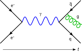 | In this Feynman diagram, an electron and a positron annihilate, producing a photon (represented by the blue sine wave) that becomes a quark–antiquark pair, after which one particle radiates a gluon (represented by the green spiral). |