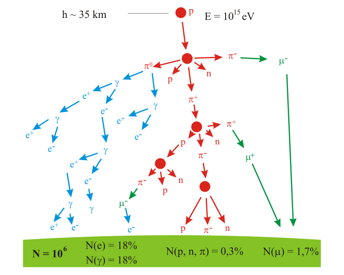 | Air shower formation in the atmosphere. First proton collides with an air molecule creating pions, protons and neutrons. |