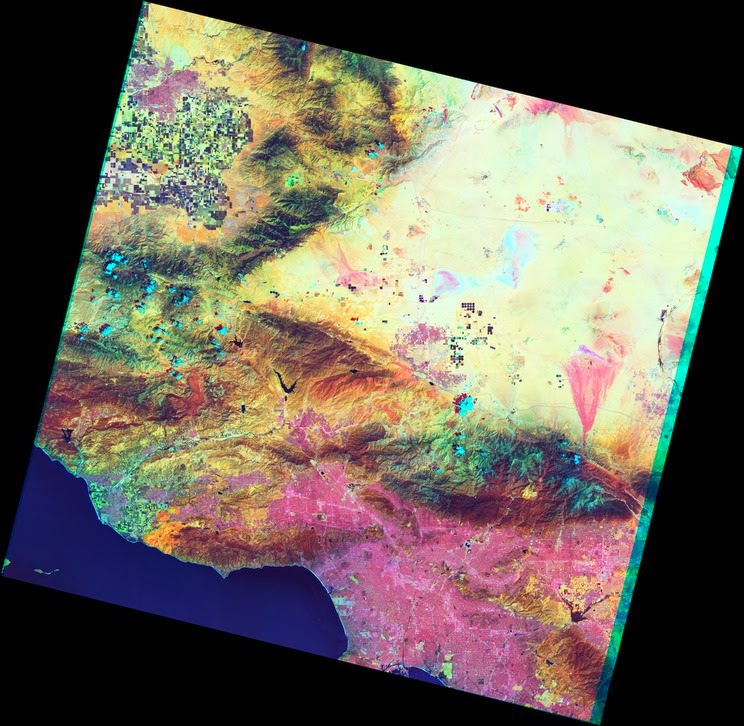 Landsat 8 measures different ranges of frequencies along the electromagnetic spectrum – a color, although not necessarily a color visible to the human eye. Each range is called a band, and Landsat 8 has 11 bands. Landsat numbers its red, green, and blue sensors as 4, 3, and 2, so when we combine them we get a true-color image such as this one: