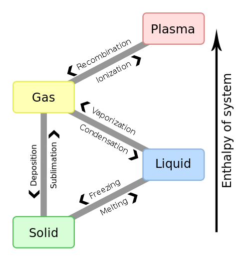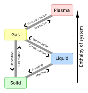 The term phase is sometimes used as a synonym for state of matter, but there can be several immiscible phases of the same state of matter. Also, the term phase is sometimes used to refer to a set of equilibrium states demarcated in terms of state variables such as pressure and temperature by a phase boundary on a phase diagram. Because phase boundaries relate to changes in the organization of matter, such as a change from liquid to solid or a more subtle change from one crystal structure to another, this latter usage is similar to the use of “phase” as a synonym for state of matter. However, the state of matter and phase diagram usages are not commensurate with the formal definition given above and the intended meaning must be determined in part from the context in which the term is used.