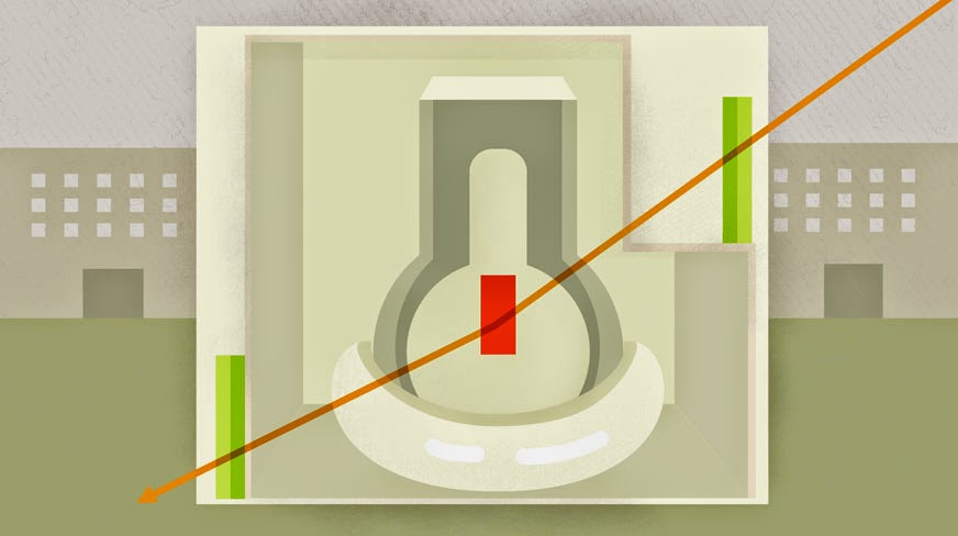| Beginning next year, two detectors (shown here in green) on either side of Fukushima Daiichi’s Unit 2 will record the path of muons (represented by the orange line) that have passed through the reactor. By determining how the muons scatter between the detectors, scientists will compile the first picture of the damaged reactor’s interior. See: Particle physics to aid nuclear cleanup |