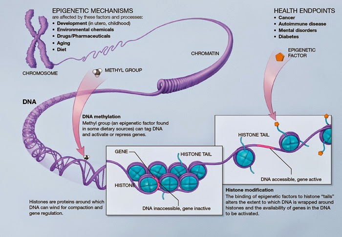 Epigenetic gene regulation involves changes other than to the sequence of DNA and includes changes to histones (proteins around which DNA is wrapped) and DNA methylation.[9] These epigenetic changes can influence the growth of neurons in the developing brain[10] as well as modify activity of the neurons in the adult brain.[11][12] Together, these epigenetic changes on neuron structure and function can have a marked influence on an organism’s behavior.[1]