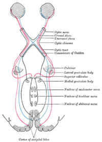 | The human visual pathway. The lateral geniculate nucleus, a region of the thalamus, exhibits thalamocortical oscillation with the visual cortex.[7] |