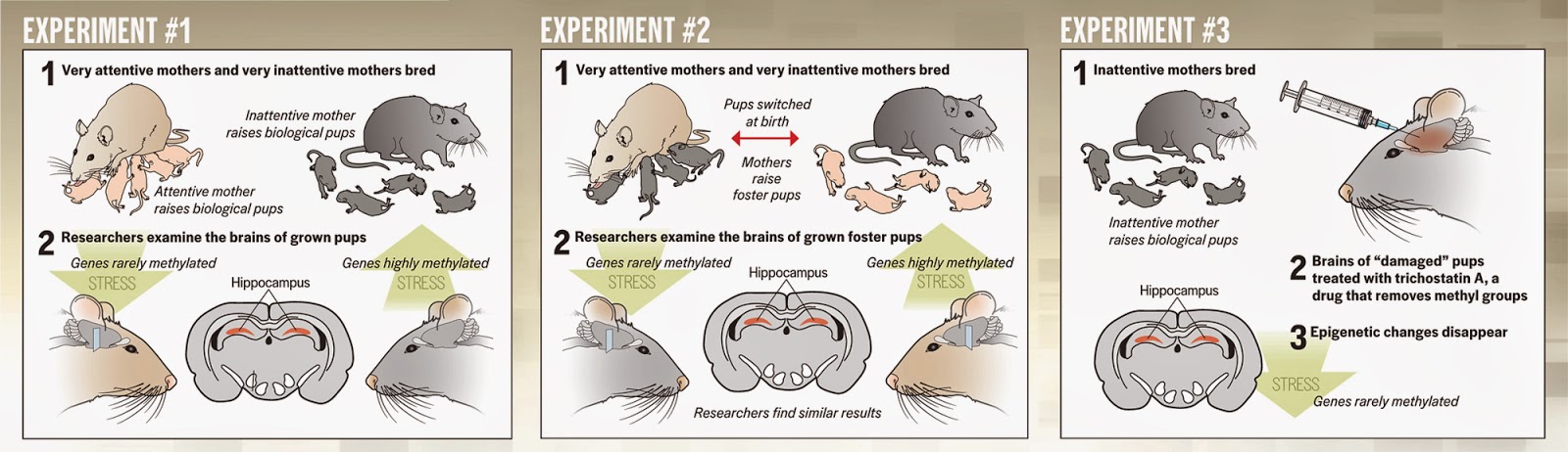 “It sounded like voodoo at first,” Szyf admits. “For a molecular biologist, anything that didn’t have a clear molecular pathway was not serious science. But the longer we talked, the more I realized that maternal care just might be capable of causing changes in DNA methylation, as crazy as that sounded. So Michael and I decided we’d have to do the experiment to find out.” See: Grandma’s Experiences Leave a Mark on Your Genes