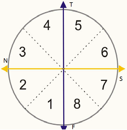 | Fig. 1. Two pairs of opposite psychological functions: Thinking and Feeling [rational opposites], Sensation/iNtuition [irrational opposites]. Jung takes this two-dimensional representation in order to demonstrate the dependencies between the psychological functions. For example, Thinking and Feeling are opposites and conflict with each other (assuming one fixed attitude). However, their effect can be modified by using the irrational functions (Sensation and iNtuition, respectively). The numbers enumerate eight sectors in dependence of what are the two dominant functions (see Table 1 and the associated text for more explanations). See Paper above for information |
