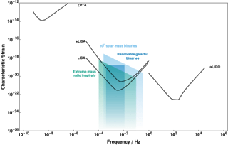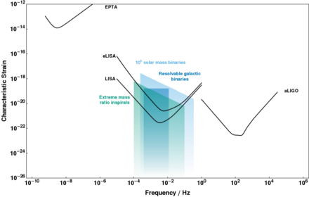 | Detector noise curves for LISA and eLISA as a function of frequency. They lie in between the bands for ground-based detectors like Advanced LIGO (aLIGO) and pulsar timing arrays such as the European Pulsar Timing Array (EPTA). The characteristic strain of potential astrophysical sources are also shown. To be detectable the characteristic strain of a signal must be above the noise curve.[27] |