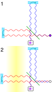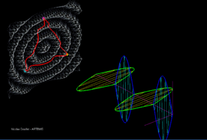 | View of amplified effects of a + polarized gravitational wave (stylized) on eLISA laser beams / arms paths. |