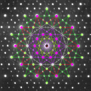 240 E₈ polytope vertices using 5D orthographic_projection to 2D using 5-cube (Penteract) Petrie_polygon basis_vectors overlaid on electron diffraction pattern of an Icosahedron Zn-Mg-Ho Quasicrystal.