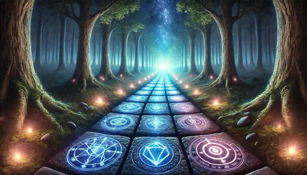 At the journey’s end, there’s a clearing where a radiant diamond lies in the heart of a reflective pool. This diamond represents the rare, profound understanding or truth—hard to find, but undeniably valuable. Its facets catch the light of the symbols and stars, embodying the synthesis of all that was learned along the way.