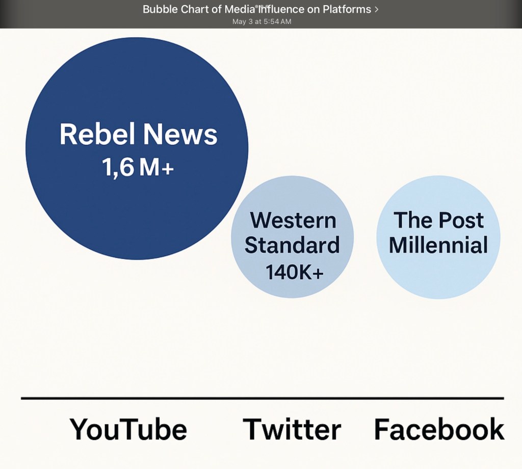 YouTube Channel: Rebel News Subscribers: Over 1.6 million Content: Daily videos with strong editorializing, focusing on anti-Trudeau, pro-oil, anti-COVID mandates, and pro-Western autonomy narratives. Influence: Enormous reach. One of the most prominent alt-media voices in Canada; its style mirrors U.S. right-wing channels like Breitbart or PragerU.