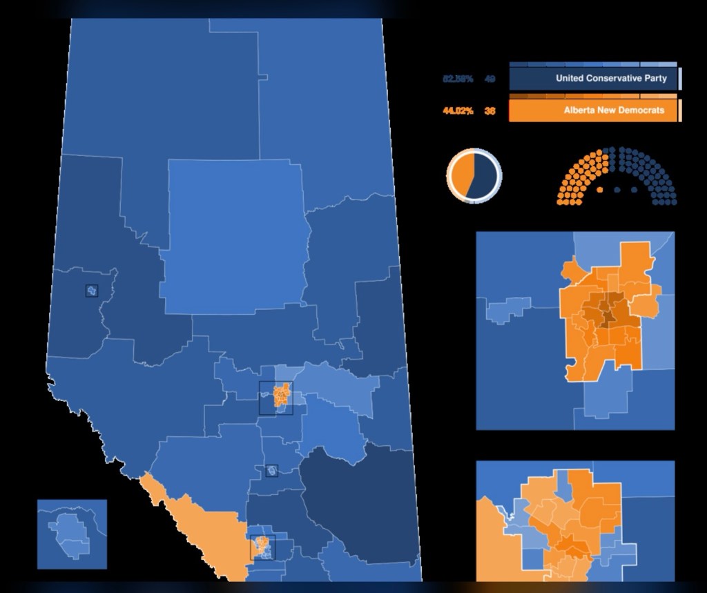 Sources: Official assembly and election reports. The seat counts above come from the Alberta Legislative Assembly (May 2025) . (The May 2023 election results were UCP 49, NDP 38 ; subsequent resignations and by-elections adjusted the standings as shown.)
