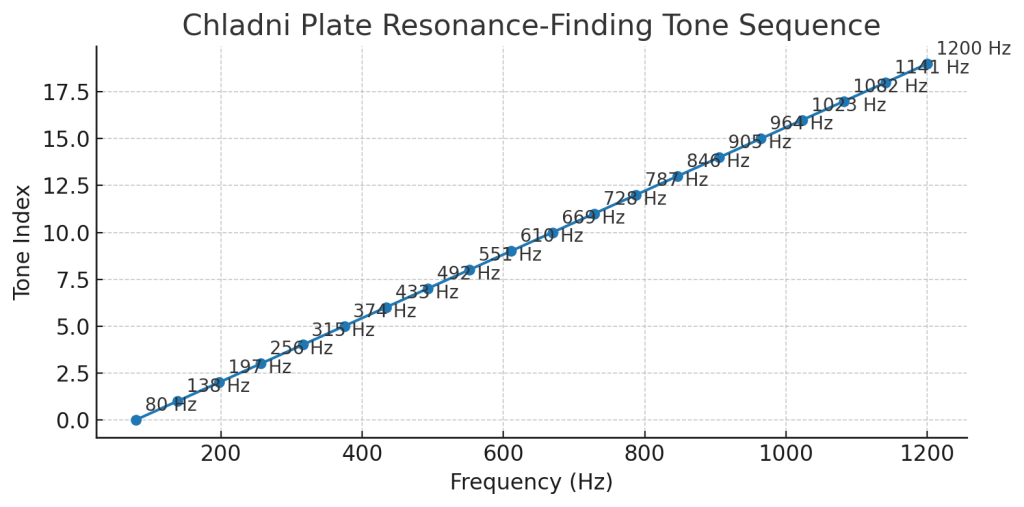 Here is a frequency sequence chart for testing Chaldni plate resonances, from 80 Hz to 1200 Hz in 20 steps.
