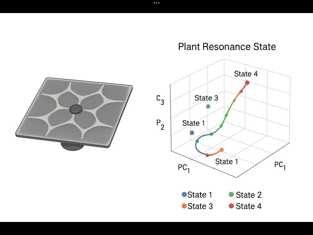 Here is a 3D PCA projection of a synthetic 20-D resonance space with four plant states and a time-trajectory overlay.